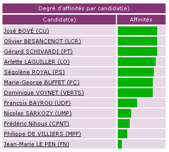 Y'a des sites qui te proposent un questionnaire pour définir tes affinités électorales, bah je suis définitivement bien de gauche, youpi: